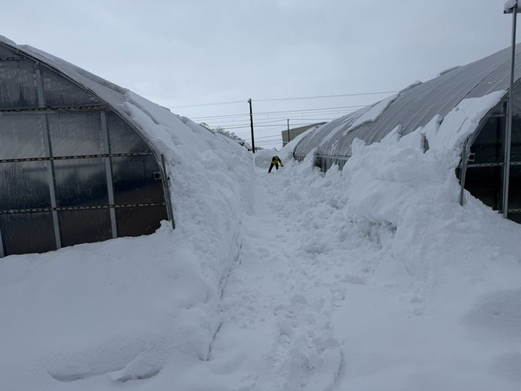 ビニールハウスの間に溜まった雪が、今にもハウスを飲み込みそうな勢いなので除雪作業をしています。